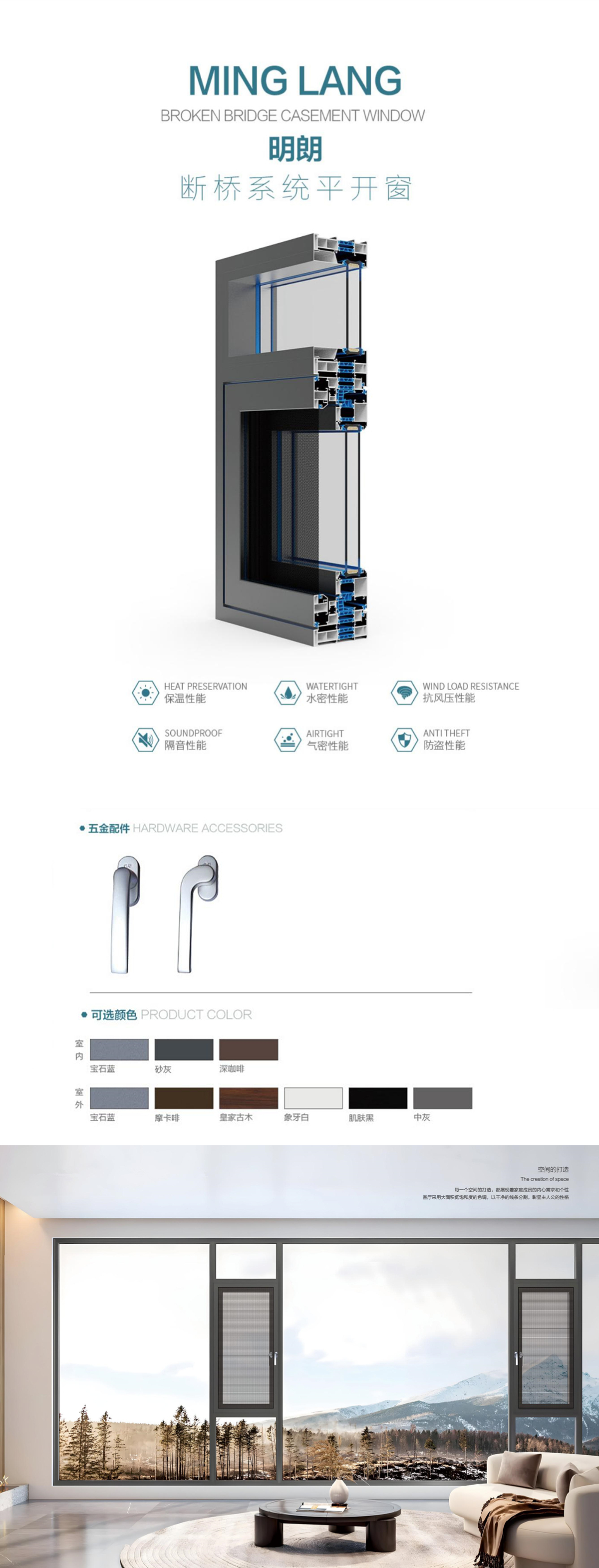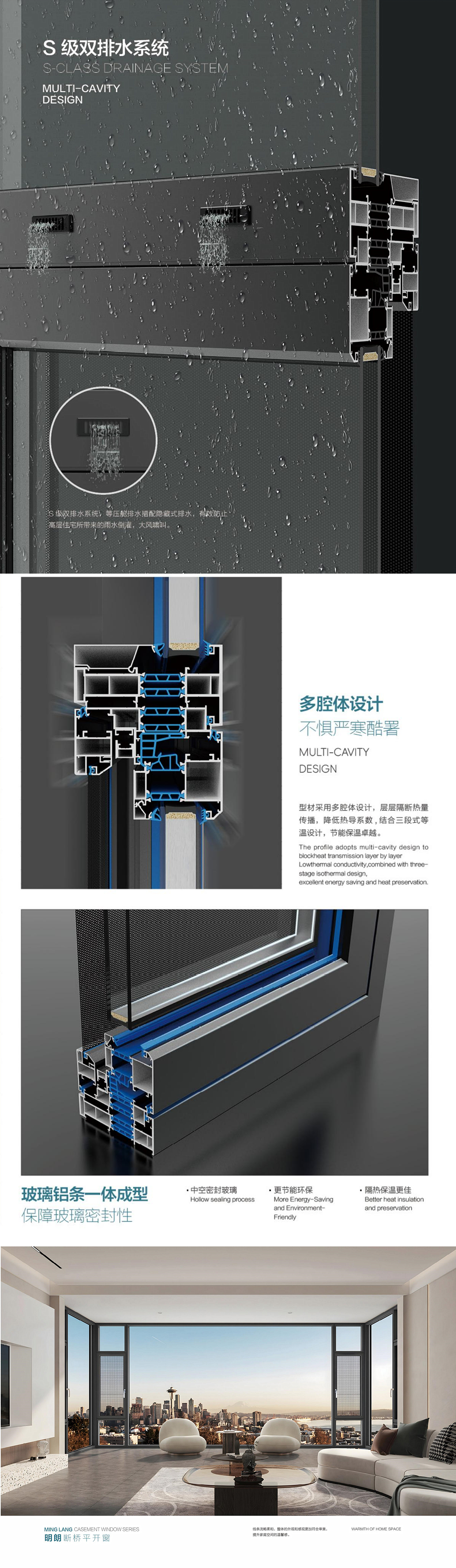 型材壁厚:2.6mm 玻扇厚度:70mm 玻扇面宽:70mm 边框占墙:118mm 边框面宽:28mm 中空规格:5mm+24A+5mm 开启方式:外开 五金配置:德国进口格屋(GU)窗纱一体五金套件产品特点1.扇玻内外压胶加高强度密封胶条,形成双重密封结构,与窗框紧密贴合。 2.内开扇圆角工艺,消除锐角磕碰风险,尤其适合有儿童/老人的家庭。 3.配防尘盖,阻挡沙尘、柳絮等进入排水通道,避免堵塞。 4.六腔体结构+垂直等温线设计,隔热保温更静音。 5.开启位一体硫化焊接鸭嘴胶,更密闭更静音。 6.标配LOW-E玻璃,阻隔99%紫外线、80%红外线,降低室内温度5-8℃。 7.纱网保护套,避免纱网与窗框直接摩擦,延长使用寿命。 8.注胶工艺,注胶填充缝隙,使窗框整体强度提升 40%。 9.固玻内外压胶,内外胶条形成气压缓冲层,隔绝空气渗透。 10.止逆阀排水系统防风防倒灌,隐藏式通道减少雨水积聚。