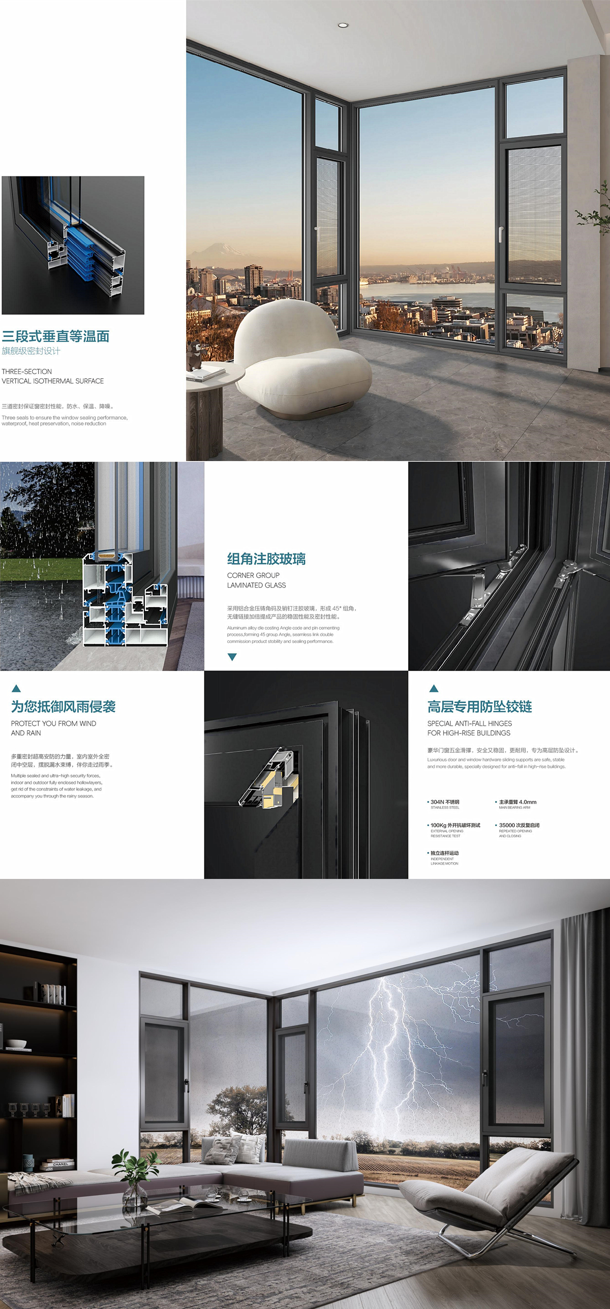 产品参数型材壁厚:2.0mm 玻扇厚度:66mm 玻扇面宽:70mm 边框占墙:112mm 边框面宽:24mm 中空规格:5mm+20A+5mm 开启方式:外开 五金配置:好博 ES 系列窗纱一体套件产品特点1.扇玻内外压胶加高强度密封胶条,形成双重密封结构,与窗框紧密贴合。 2.内开扇圆角工艺,消除锐角磕碰风险,尤其适合有儿童/老人的家庭。 3.配防尘盖,阻挡沙尘、柳絮等进入排水通道,避免堵塞。 4.四腔体结构 + 垂直等温线设计,隔热保温更静音。 5.标配 LOW-E玻璃,阻隔99%紫外线、80%红外线,降低室内温度5-8℃6.纱网保护套,避免纱网与窗框直接摩擦,延长使用寿命。 7.注胶工艺,注胶填充缝隙,使窗框整体强度提升 40%。 8.固玻内外压胶,内外胶条形成气压缓冲层,隔绝空气渗透。 9.止逆阀排水系统防风防倒灌,隐藏式通道减少雨水积聚。 10.闭口式大压线小压线可选,安全又具性价比。